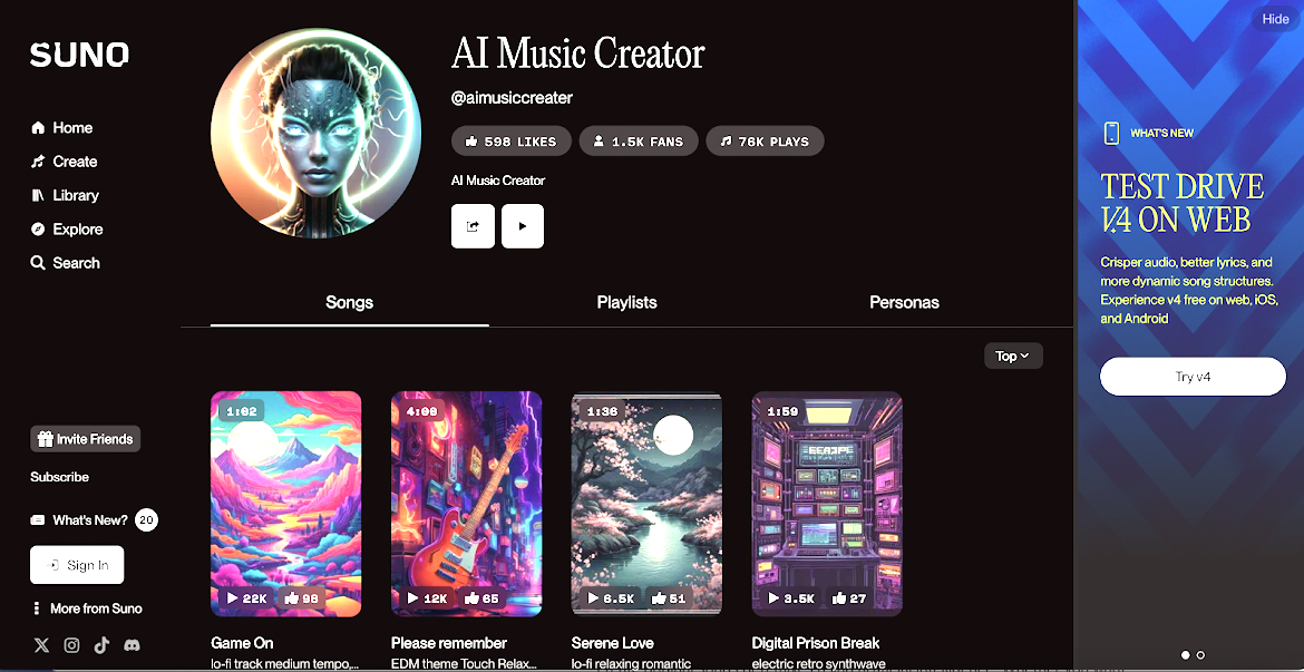 • Частота дискретизации: В последних версиях Suno ai music достигает 44.1 кГц (CD-качество).