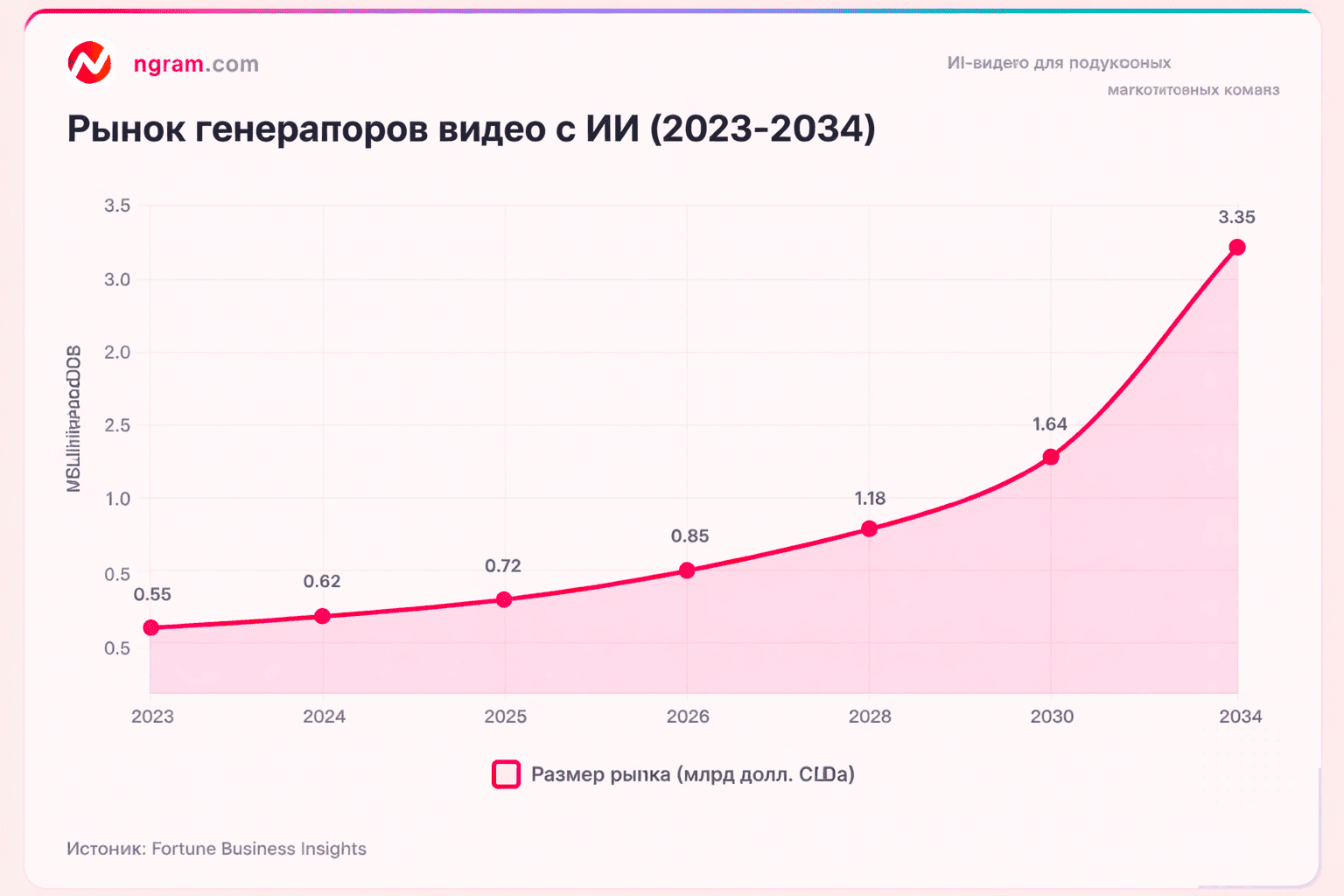 На 2025 год объем мирового рынка генераторов видео на базе искусственного интеллекта оценивается в 716,8 миллиона долларов. Прогнозы на 2026 год свидетельствуют о росте до 847 миллионов долларов, что соответствует ежегодному увеличению на 18,8%. Это темпы роста, которые сопровождаются дальнейшим увеличением до 3,35 миллиардов долларов в 2034 году. Этот прогноз подтверждается отчетами компании Fortune Business Insights.