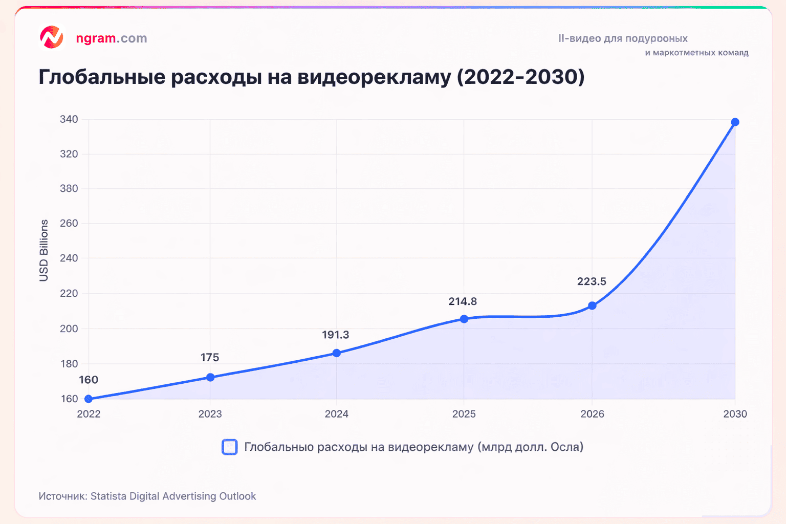 Ожидается, что глобальные расходы на цифровую видеорекламу достигнут 223,5 миллиардов долларов в 2026 году, с прогнозируемым ростом на 9,5% ежегодно. К 2030 году эта цифра вырастет до 338,6 миллиардов долларов. (Statista)