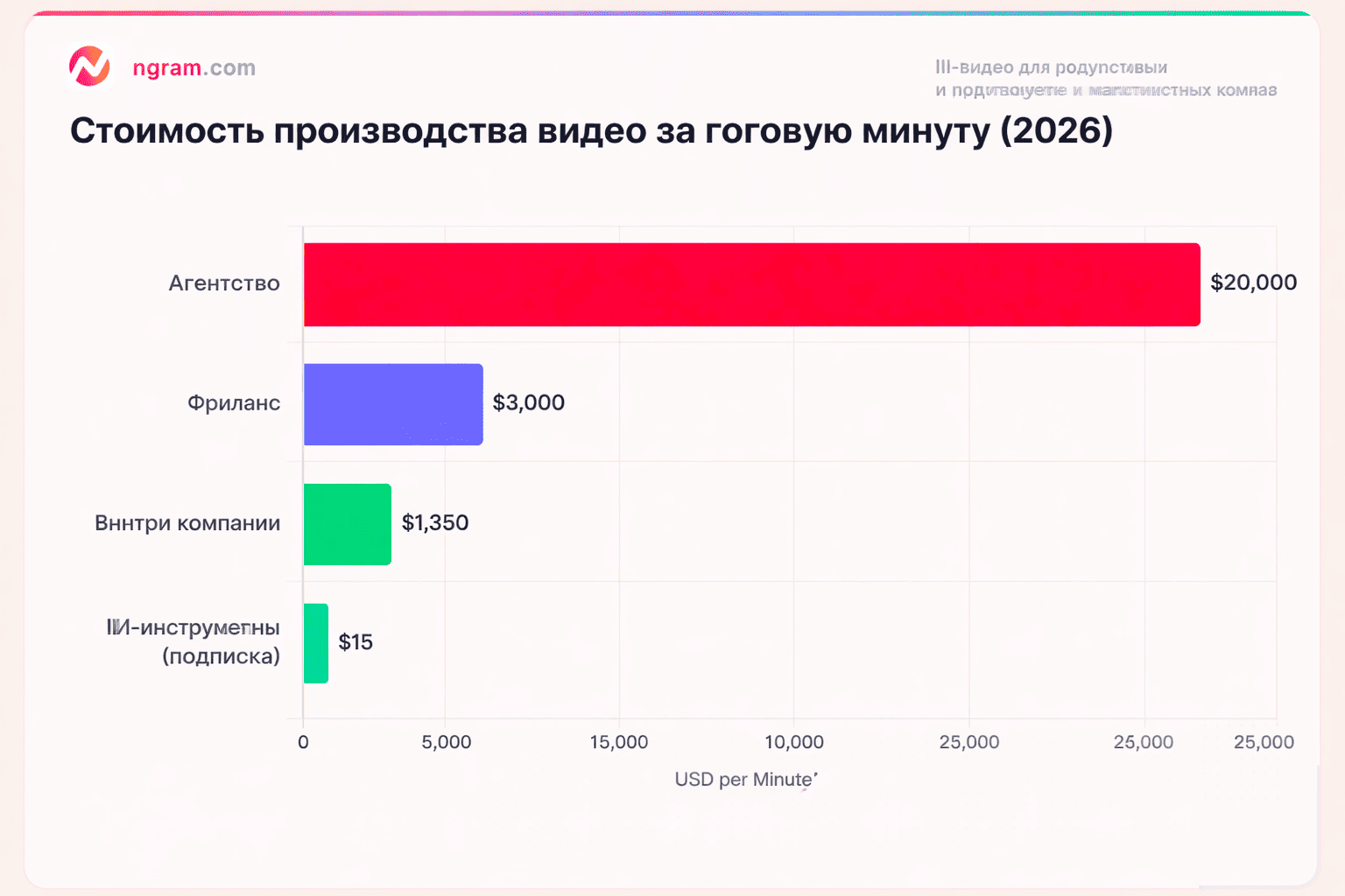 Для производства 1 минуты видео с использованием традиционных методов (работа с фрилансерами или агентствами), компании должны учитывать следующие затраты: -